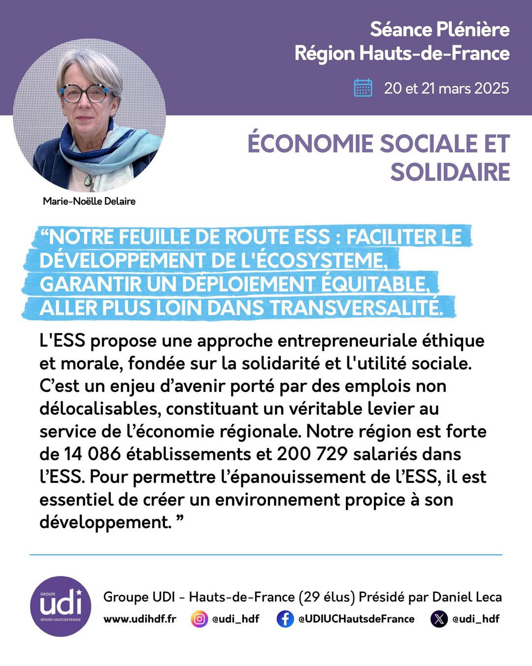 Notre Vice-Présidente Marie-Noëlle Delaire a présenté lors de la séance plénière de mars 2025 la feuille de route régionale pour le soutien aux structures de l'ESS : « L'Économie Sociale et Solidaire, c'est le choix du circuit court, de la proximité et de la mise en synergie des acteurs économiques locaux »