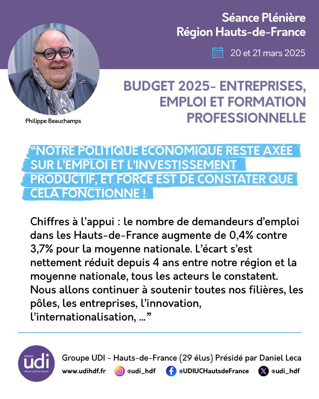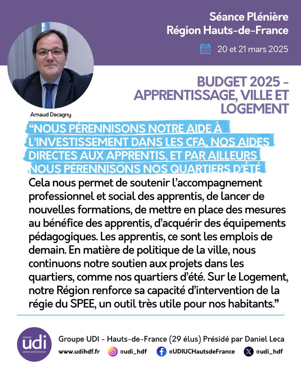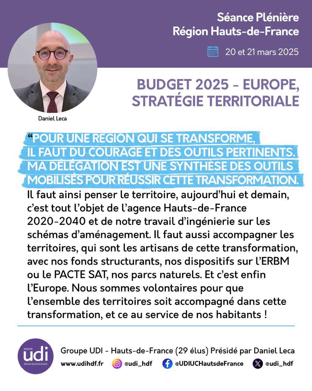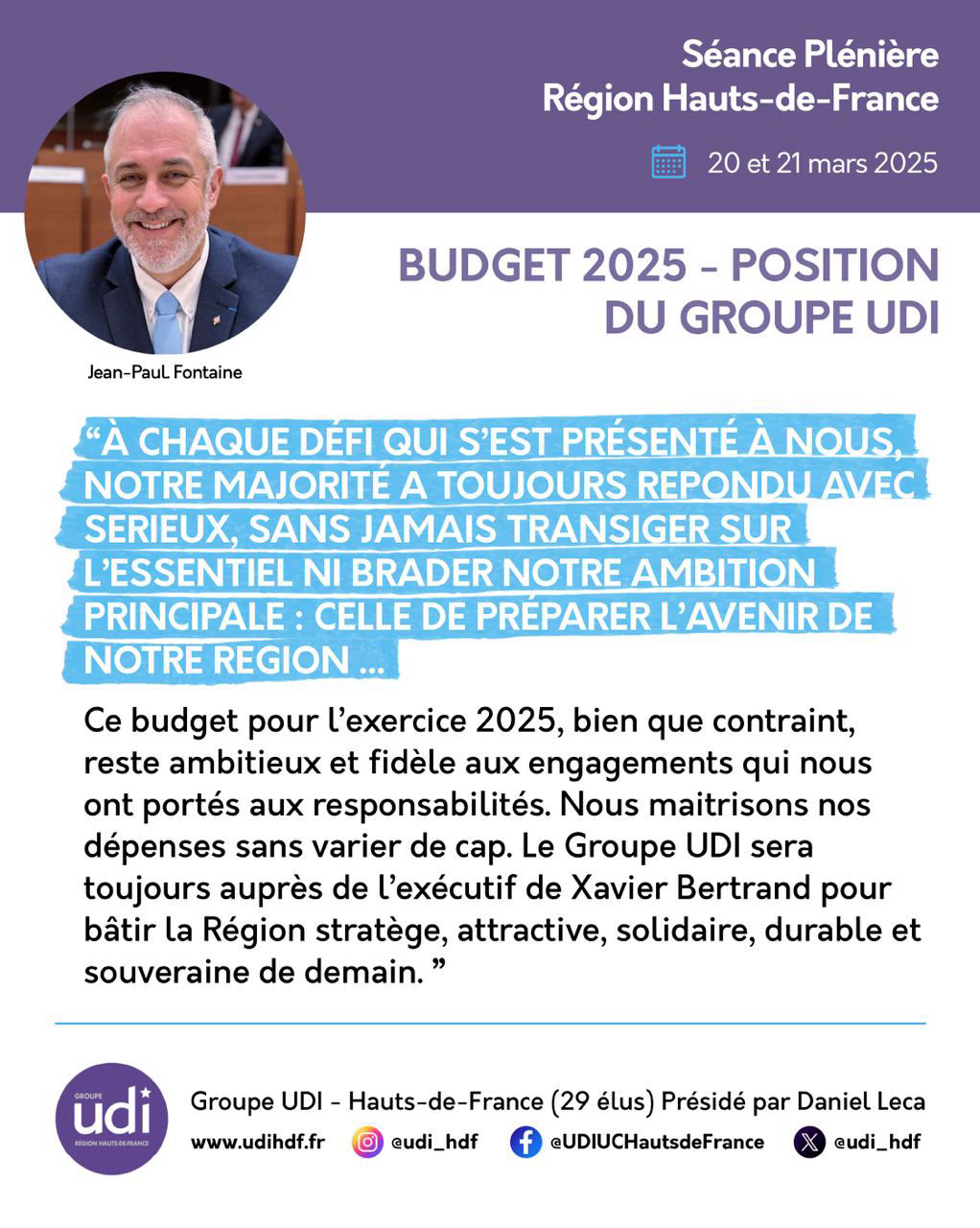 Notre Région a adopté son budget lors de la séance plénière des 20 et 21 mars 2025. À cette occasion, nos vice-présidents Daniel Leca, Philippe Beauchamps, Arnaud Decagny, Brigitte Fouré et Marie-Noëlle Delaire ont détaillé leur feuille de route pour l'exercice 2025. Notre région est pleinement entrée dans une transformation en profondeur en matière de développement économique, sociale, sociétale et environnementale. Jean-Paul Fontaine a porté la voix du groupe UDI : « À chaque défi qui s'est présenté à nous, notre majorité a toujours répondu avec sérieux, sans jamais transiger sur l'essentiel, ni brader notre ambition principale : Celle de préparer l'avenir de notre Région ... » Ce budget pour l'exercice 2025, bien que contraint, reste ambitieux et fidèle aux engagements qui nous ont portés aux responsabilités. Nous maitrisons nos dépenses sans varier de cap. Dans la majorité régionale, le groupe UDI bâtit une Région stratège, attractive, solidaire, durable et souveraine.