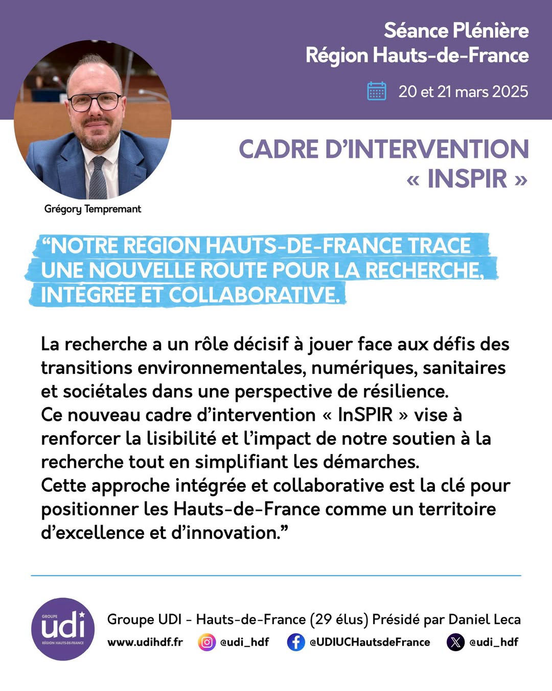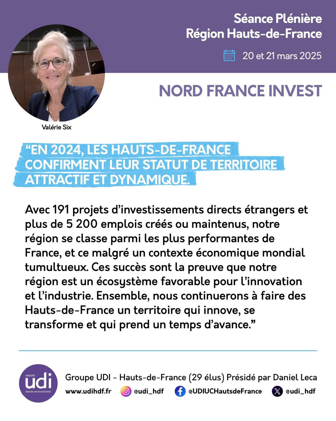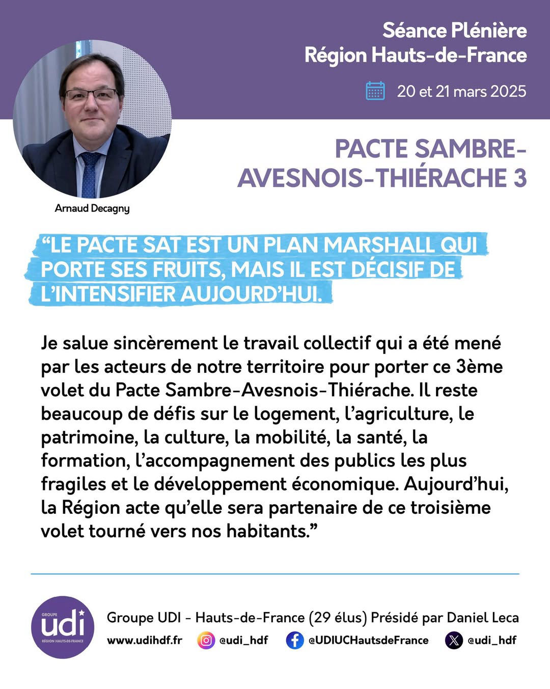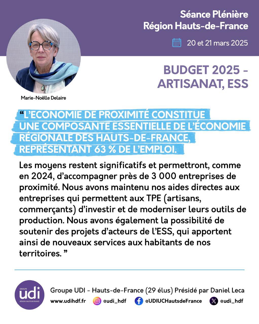Notre Région a adopté son budget lors de la séance plénière des 20 et 21 mars 2025. À cette occasion, nos vice-présidents Daniel Leca, Philippe Beauchamps, Arnaud Decagny, Brigitte Fouré et Marie-Noëlle Delaire ont détaillé leur feuille de route pour l'exercice 2025. Notre région est pleinement entrée dans une transformation en profondeur en matière de développement économique, sociale, sociétale et environnementale. Jean-Paul Fontaine a porté la voix du groupe UDI : « À chaque défi qui s'est présenté à nous, notre majorité a toujours répondu avec sérieux, sans jamais transiger sur l'essentiel, ni brader notre ambition principale : Celle de préparer l'avenir de notre Région ... » Ce budget pour l'exercice 2025, bien que contraint, reste ambitieux et fidèle aux engagements qui nous ont portés aux responsabilités. Nous maitrisons nos dépenses sans varier de cap. Dans la majorité régionale, le groupe UDI bâtit une Région stratège, attractive, solidaire, durable et souveraine.