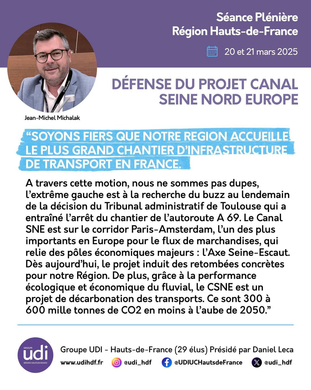 Lors de la Séance Plénière du 14 décembre 2023, nos élus ont adopté le budget 2024 du Conseil Régional des Hauts-de-France 2024. C'est notre élu Jean-Paul Fontaine qui a porté la voix de notre Groupe. « Un budget qui nous permet de continuer à soutenir nos territoires, à investir de façon ambitieuse dans notre avenir régional, comme nous le faisons depuis 2016. Nous restons particulièrement inquiets sur le désengagement financier de l’État envers les collectivités ». La séance s'est terminée par un débat public sur le Canal Seine Nord Europe en présence de Jérôme Dezobry, Président du directoire. Daniel Leca, Président du Groupe UDI, a recadré les élus LFI du Groupe Gauche Républicaine et Écologique : « Rendez-vous compte que le combat écologique, sur le Canal Seine Nord, a été gagné. Vous faites du mal au débat démocratique ! »